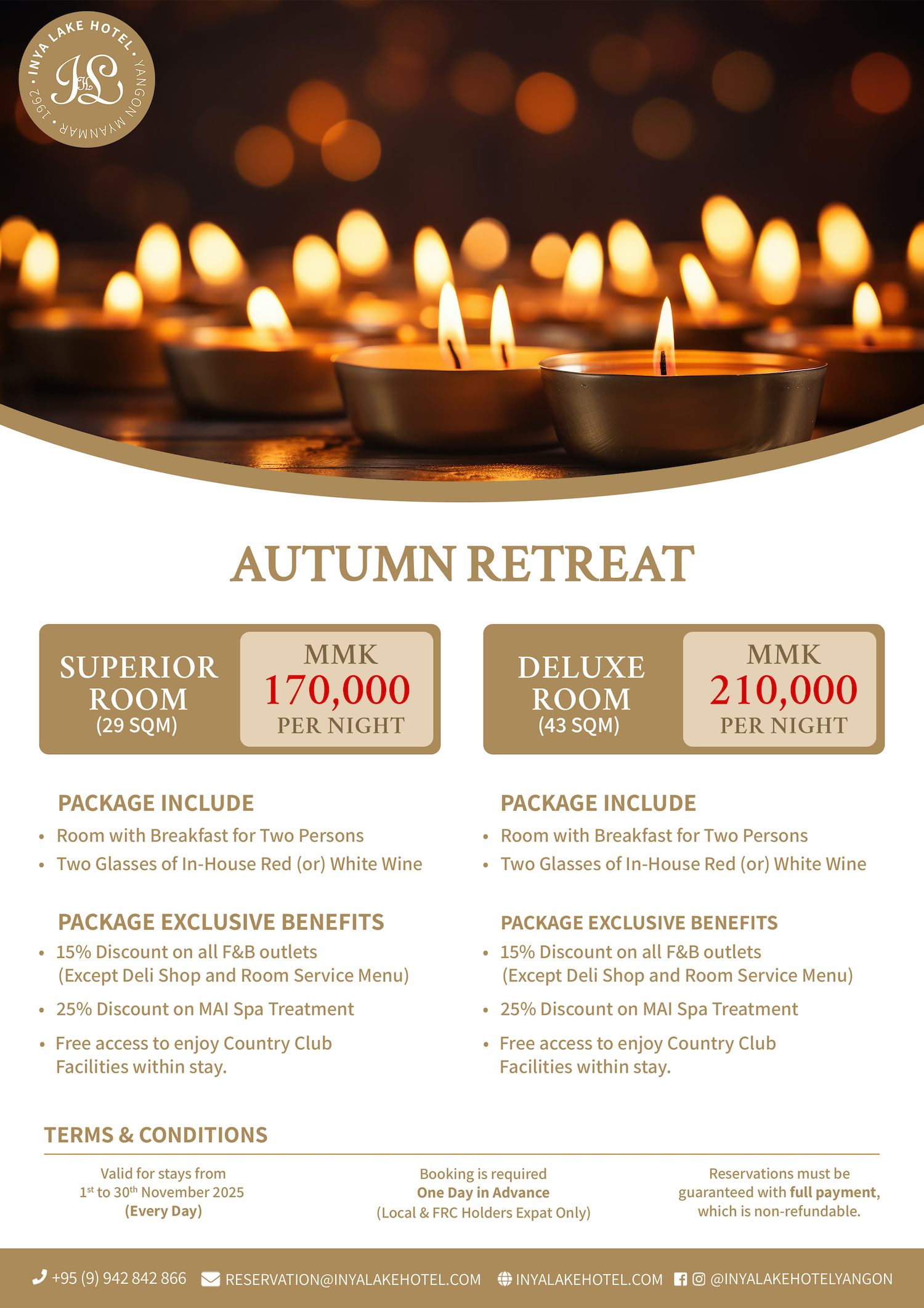 - ▪ 15% Discount on Inya Lake Restaurant’s A La Carte Menu